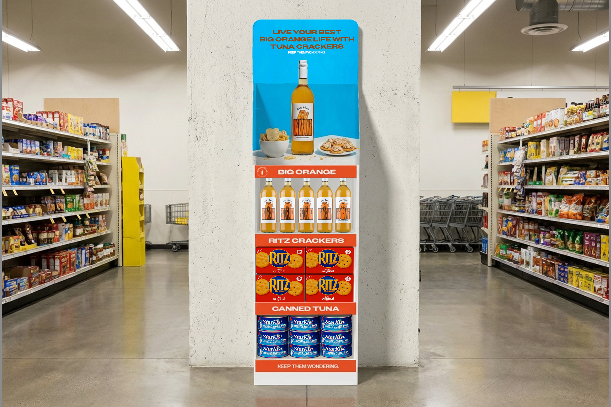 Utilizing unconventional shelf talkers and shopping cart placards to disrupt the autopilot grocery run and spark curiosity.